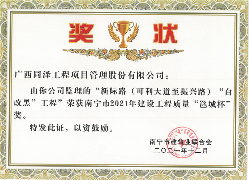 新際路(可利大道至振興路)“白改黑”工程榮獲南寧市2021年建設工程質(zhì)量“邕城杯”獎