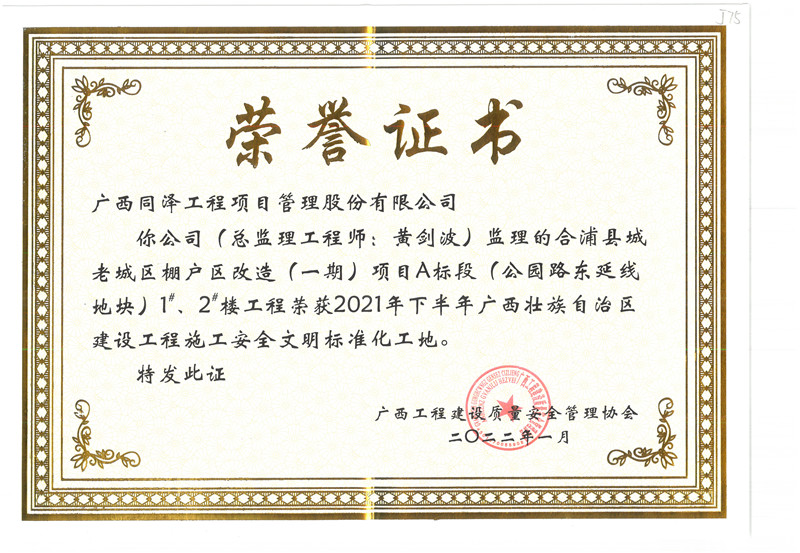 合浦縣城老城區(qū)棚戶區(qū)改造(一期)項目A標段項目榮獲2021年(下半年)廣西壯族自治區(qū)建設工程施工安全文明標準化工地